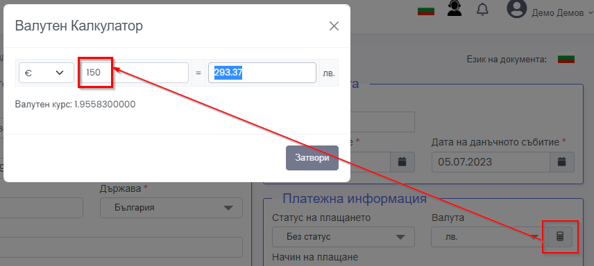 В калкулатора можете да изберете валутата, в която сте направили продажбата, в примера сме дали 150€, калкулатора автоматично ще пресметне правилната сума в лева, която да използвате при създаване на продукта.